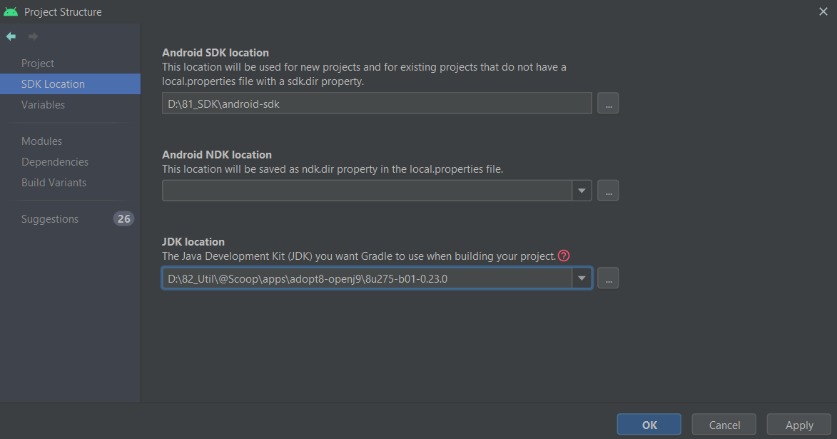 (Windows의 경우) File -> Project Structure -> SDK Location -> JDK location